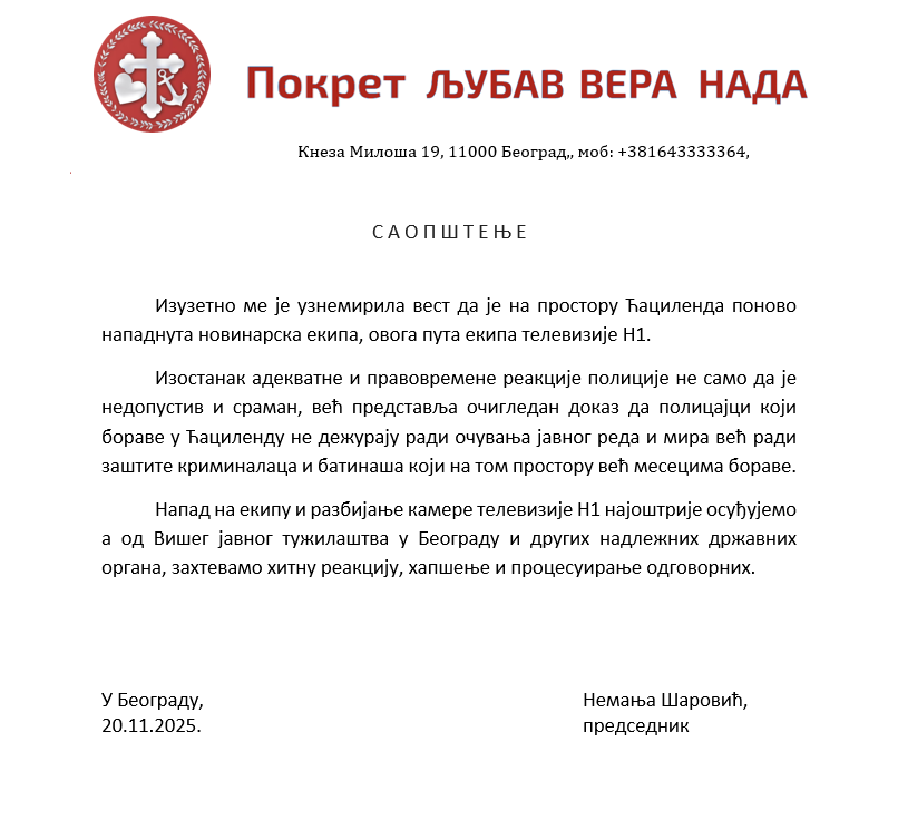 Lider Pokreta LJUBAV VERA NADA, Nemanja Šarović oglasio se saopštenjem povodom današnjeg napada na ekipu N1 televizije.