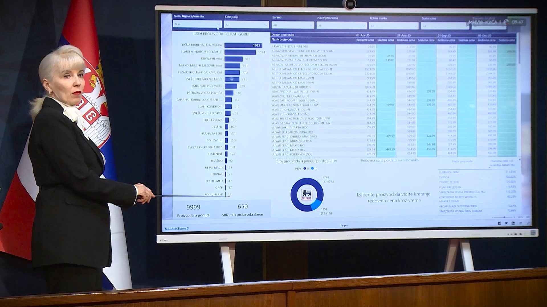 Dodala je da ovaj posao ne bi mogao da se završi bez bliske saradnje sa Kancelarijom za IT i eUpravu i posebno je zahvalila direktoru te kancelarije Mihailu Jovanoviću i njegovom timu koji su, kako je naglasila, danonoćno radili na obradi i prilagođavanju podataka koje su trgovinski lanci slali. Ministarka je dodala i da novi Zakon o zaštiti potrošača, predviđa da dostavljanje cenovnika postane zakonska obaveza što je važan korak za dalju stabilizaciju cena.