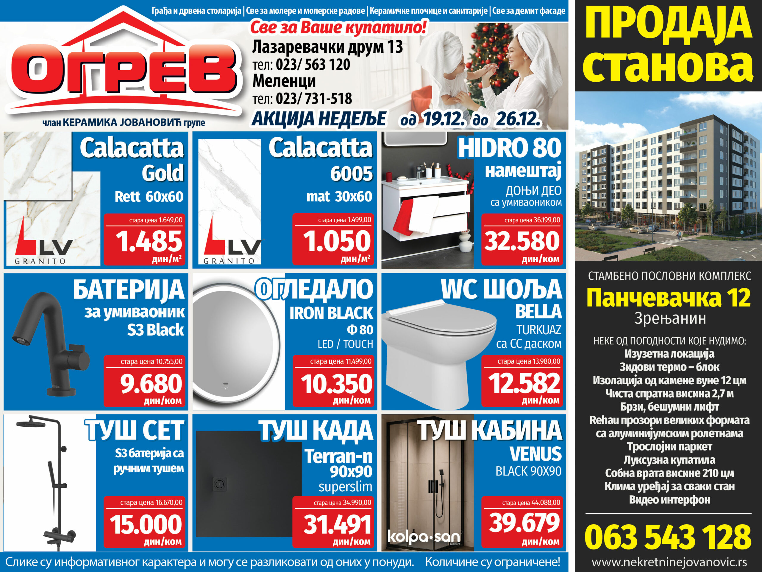 Do 26. decembra u Ogrevu iskoristite novu akciju i na popustu priuštite sebi novi tuš set za 15.000 din., Terann-n Tuš kadu za 31.491 dinar ili Venus Tuš kabinu po ceni od 39.679 dinara. Takođe na popustu možete za 9.680 dinara kupiti bateriju za umivaonik, Bella Wc šolju sa samospuštajućom daskom za 12.582 dinara ili kupatilski nameštaj Hidro 80 donji deo sa umivaonikom za 32.580 dinara. Ogledajte se u novom ogledalu Calacatta gold 60×60 koji može biti vaš za 1.485 dinara, Calacatta 6005, 30×60 za 1.050 dinara ili Iron black ogledalo led touch za 10.350 dinara.