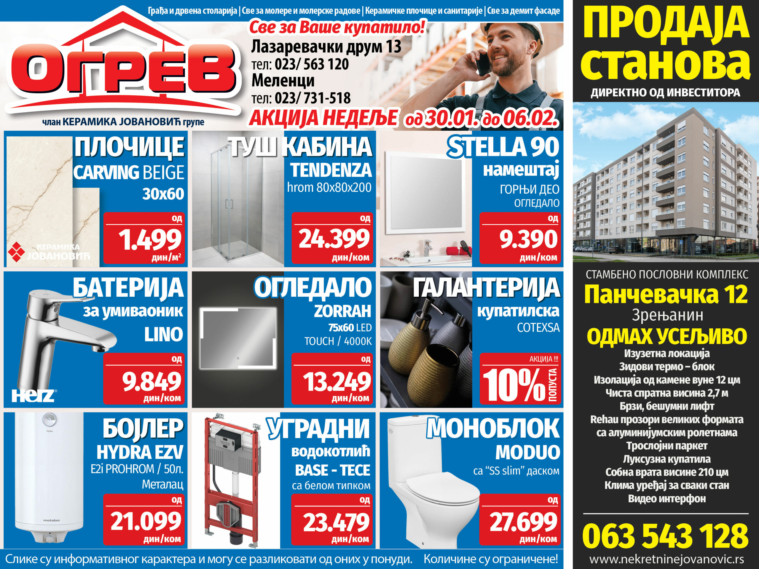 Nova nedeljna akcija Ogreva traje do 6. februara. Iskoristite ovu ponudu i po akcijskim cenama kupite bojler, mono blok, kupatilska ogledala ili obnovite kupatilsku galanteriju.
