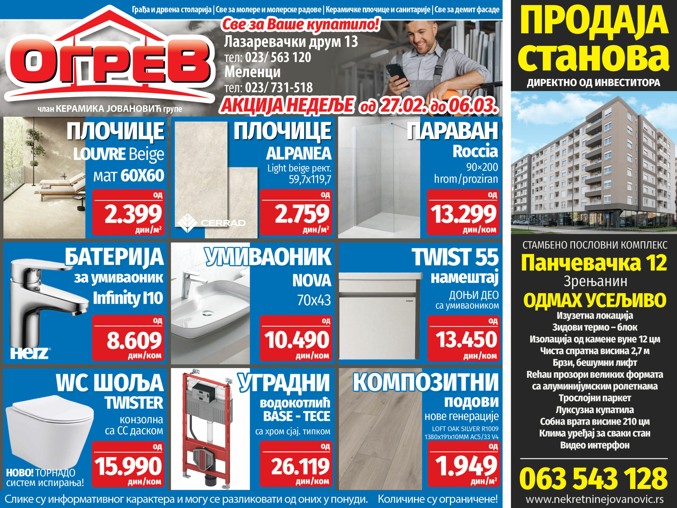 Akcija nedelje na stovarištima Ogrev počinje 27. februara i traje do 06. Marta. Pločice Louvre Beige koštaće 2.399 dinara po kvadratu, pločice Alpanea light beige koštaće 2.759 dinara po kvadratu, a cena kompozitnih podova nove generacije Loft Oak Silver biće od 1.949 dinara za kvadratni metar. Tokom akcije nedelje paravan Roccia, hrom proziran, dimenzija 90×200 moći ćete da kupite za 13.299 dinara. Baterija za umivaonik Infinity i10 moći će da se kupi za 8.609 dinara, a umivaonik Nova dimenzija 70×43 za 10.490 dinara. Akcija nedelje obuhvata i donji deo kupatilskog nameštaja sa umivaonikom Twist 55, čija je akcijska cena 13.450 dinara, kao i konzolnu wc šolju Twister, sa tornado sistemom ispiranja, čija je cena 15.990 dinara. Ugradni vodokotlić Base-Tece tokom akcije koštaće 26.119 dinara.
