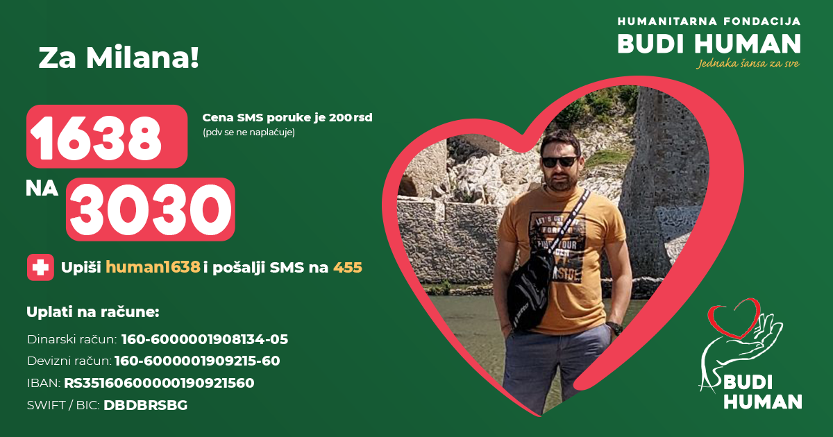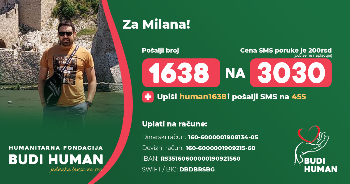 Pomozite Milanu slanjem SMS poruke sadržine 1638 na 3030, uplatom na dinarski račun: 160-6000001908134-05, uplatom na devizni račun: 160-6000001909215-60, IBAN: RS35160600000190921560, SWIFT/BIC: DBDBRSBG.