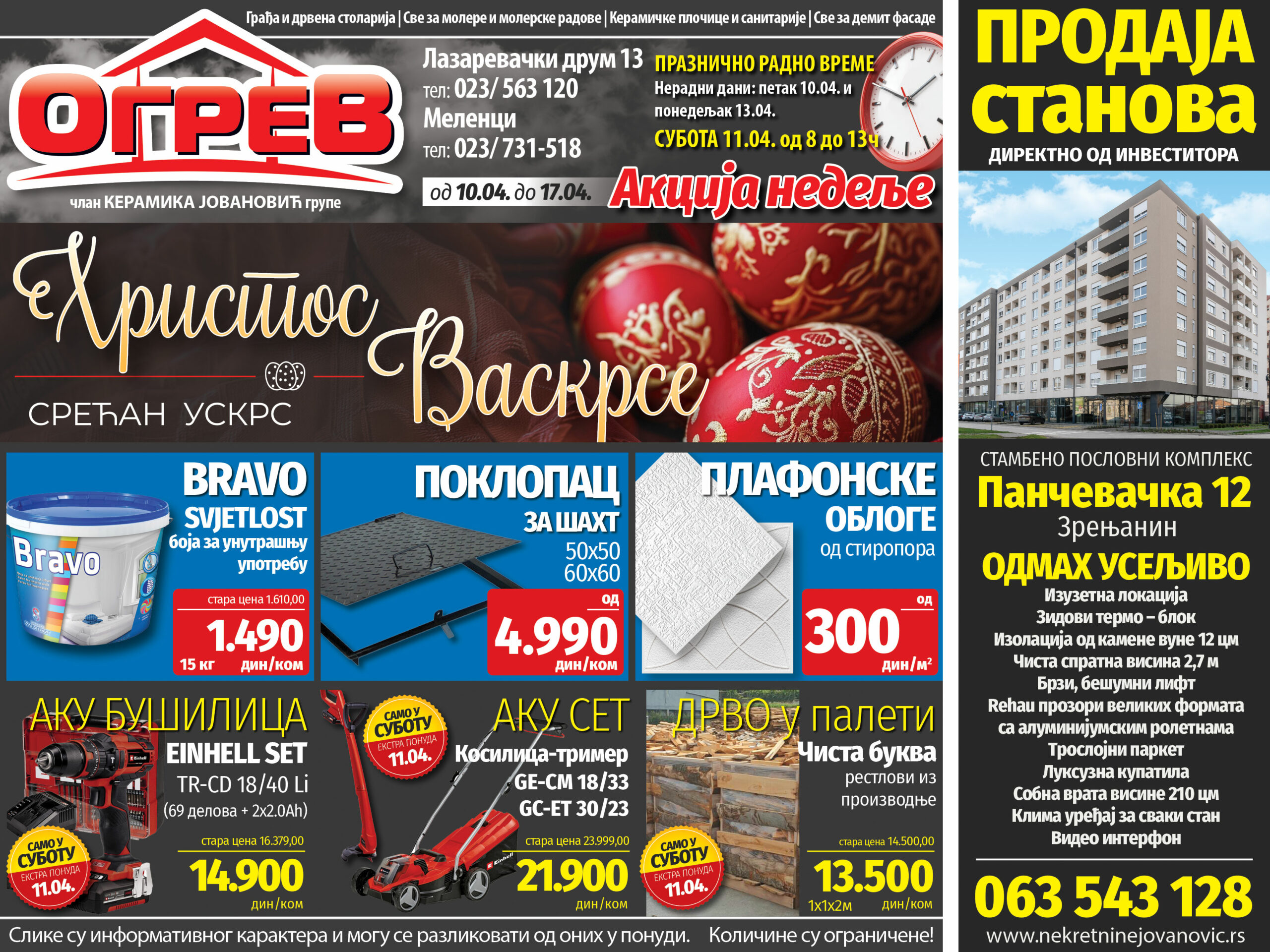 Nova akcija nedelje u Ogrevu počinje sutra i trajaće do 17. aprila. Na popustu će biti boja za unutrašnju upotrebu, poklopac za šaht i plafonske obloge od stiropora. Samo u subotu, 11. aprila, u okviru ekstra ponude na popustu će biti aku bušilica, aku set kosilica i trimer i drvo u paleti.